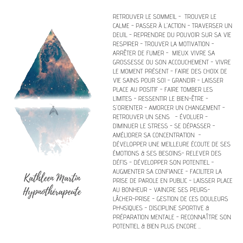 Très différente de l’hypnose de scène, l’hypnose thérapeutique est une approche s’adressant à toute personne âgée de 7 ans et plus et ayant la capacité d’entendre. Agissant dans la douceur et le calme, l’hypnose est un outil fort efficace qui permet de se recentrer vers soi afin d’atteindre un mieux-être. Tout le monde peut vivre l’état d’hypnose, il suffit seulement d’accorder un intérêt envers cet outil et un brin de motivation. Il y a toutefois une contre-indication qui est de vivre ou d’avoir vécu des épisodes psychotiques. En cas de doutes ou de questionnements, veuillez m’en aviser.